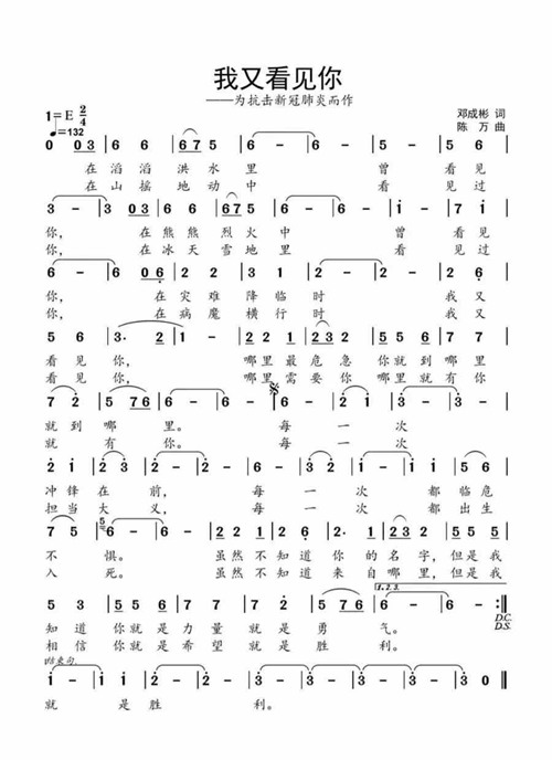 面对突如其来的疫情,三军将士慷慨奔赴疫情一线。每当祖国和人民需要的时候,人民子弟兵总是奔向最危险的地方。我系三位男高音歌唱家唐竹雅老师、陈万老师、张运超老师深情演绎由邓成彬作词、陈万作曲的原创音乐作品《我又看见你》,歌颂奋战在一线的最美“逆行者”,是他们用爱与担当,捍卫着全国人民的生命安全。字字铿锵,向每一位平凡而伟大的前线抗击疫情工作者致敬。