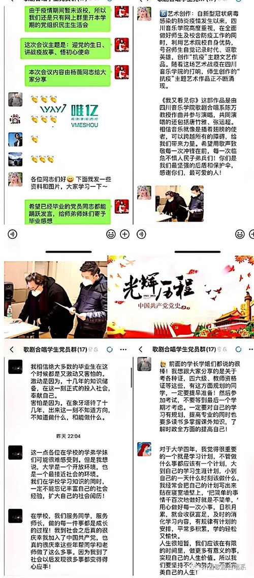 迎党的生日、悟初心使命——歌剧合唱系主题党日活动 2020年是不平凡的一年,为庆祝中国共产党建党99周年,进一步教育引导广大党员不忘初心、牢记使命,6月29日歌剧合唱系学生支部通过微信群聊平台开展了:“迎七一、讲战疫故事、悟初心使命”主题党日活动。 这次党日活动主题是:迎党的生日、讲战疫故事、悟初心使命。本次会议由歌剧合唱系学生党支部书记穆阳老师主持,党小组组长杨薇同志给大家分享了关于在战“疫”期间的先锋故事、教学管理、艺术创作等等事迹。 一次生动主题党日活动,一次深刻学习。今年六月份才毕业的党员同志们积极交流踊跃发言,给师弟师妹们分享了自己的毕业感想和宝贵的经验,也给师弟师妹们提出了中肯的意见和建议。 最后,大家重温了入党誓词,一句句铮铮的誓言,忆起的是入党时坚定不移的初心,振奋的是使命在肩勇担当的决心,牢守的是党的理想信念和根本宗旨的恒心。