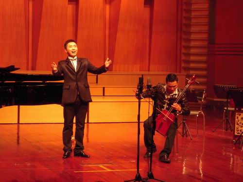 5月7日晚8:00,我系09届声乐硕士研究生宋国旭毕业音乐会在我院大音乐厅隆重举行。音乐会上无虚席。 音乐会上,宋国旭同学不仅演唱了多首不同风格的民族歌曲,其中包括山西民歌、蒙古民歌、新疆民歌及原生态歌曲等,还采用除钢琴伴奏以外的多种伴奏形式,如:古琴、箫、马头琴、民族乐队。音乐会上,一首《感谢你》深深打动在场的每位观众,整场音乐会一直掌声不断,最后以一首欢快轻松的《黄杨扁担》结束。