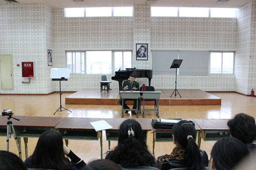 11月5日、6日两天,中国人民解放军第二炮兵政治部文工团歌队艺术指导邓垚专家来我系讲学。这次讲学是由我系钢琴伴奏研室组织的。 第一天上午重点讲了钢琴伴奏艺术理论知识,针对钢琴艺术指导阐述了自己的观点和认识。余下的时间全部用在钢琴伴奏和声乐演唱的即兴配合,并针对我系钢琴伴奏教师做了悉心指导,让全系师观摩生聆听了钢琴伴奏即兴发挥的独特魅力以及与专家的零距离接触,感受专家授课。两天的讲学时间让我系师生受益匪浅,得到我系师生的一致好评。