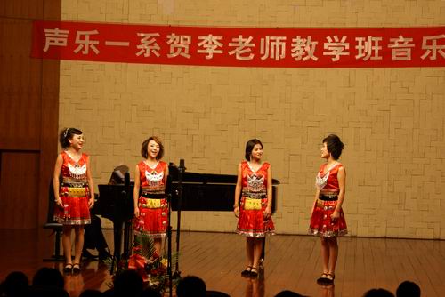 11月29日晚7:30分,贺李老师教学班音乐会在我院小音乐厅举行,音乐会以一首云南民歌《猜调》拉开序幕,学生们把乐曲中的温柔、热烈、轻快、辉煌以及富有戏剧性的强烈感情演绎淋漓尽致,不同的民族演唱风格带给观众不同的艺术享受,演员们精彩绝伦的表演嬴得了观众们一次又一次热烈的掌声,把音乐会推上了一个又一个高潮。 整场音乐会一直在热烈、高雅、轻松的环境中进行,演出圆满成功。
