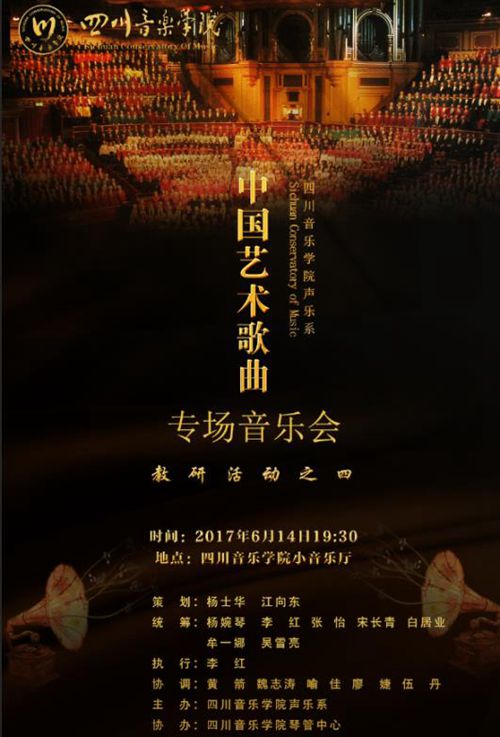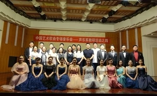 2017年6月14日我系于小音乐厅成功举办“中国艺术歌曲专场音乐会”,本次音乐会由杨士华主任,江向东书记总策划,声乐教研室主任李红,杨婉琴,张怡,白居业,宋长青,钢琴伴奏教研室牟一娜,吴雪亮统筹,李红副教授执行。     这次的音乐会是我系开展的系列教研活动之四。此前的系列音乐会均受到大家一致好评。在本次音乐会上,参加演出的20位同学和他们的艺术指导老师逐一上台表演了不同风格时期的中国艺术歌曲,通过这次音乐会不但丰富了同学们的舞台经验,更为重要的是增加声乐学生对中国作品的认识和理解能力,从而唱好中国歌,弘扬本民族的文化。