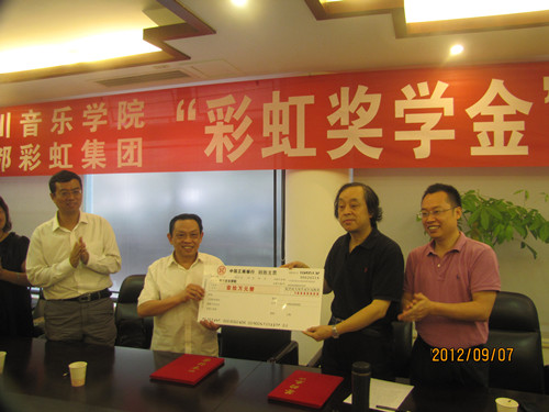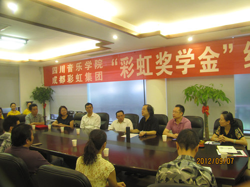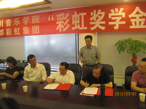 “彩虹奖学金”续签仪式在我院举行 9月7日上午,彩虹集团、beat365在线唯一官网“彩虹奖学金”续签仪式在我院举行。院长易柯,副院长孙洪斌与彩虹集团董事长刘荣富,集团总经理、党委书记、人力资源部长等领导班子一行六人出席了续签仪式。院计财、科研处、宣传部、学报负责人及声乐二系领导、师生代表参加了仪式。 易院长对彩虹集团在川音设立“彩虹奖学金”给予了高度赞誉和诚挚感谢。刘董事长概括介绍了彩虹集团的发展,并对川音的发展和取得的成绩给予了很高的评价。最后,院长易柯、彩虹集团董事长刘荣富分别在协议书上签字. 彩虹集团是全国著名的民营企业,该企业曾面临破产,后经艰苦奋斗,发展到今天每年向国家上缴近一亿元利税的著名企业集团。其董事长刘荣富也被选为即将召开的党的“十八大”代表。 为感谢党的改革开放政策,回报社会,该集团每年均捐资于教育、社会公益等利民事业。2005年始,每年捐资于川音10万元,用于声乐二系奖励优秀学生的学习和青年教师的进修提高。至今,该系已有80多名师生享受了该奖,这对于激励我院声乐表演人才的培养,声乐科研、师生艺术实践水平的提高等方面都起到了非常好的积极促进作用。 签字仪式由党、院办主任宋瑛主持。