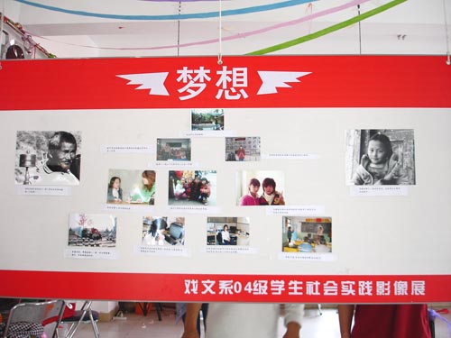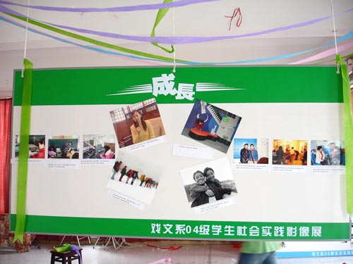 我系2004级学生社会实践影像资料于06年4月10日到13日,在新校区学生活动中心展出。参展资料翔实,内容丰富。涉及面广。从不同角度反映了同学们社会实践所涉及的行业和取得的成绩。敖昌群院长等领导在戏文系主任王慧才的陪同下,饶有兴趣地参观了展览并题词。期间共有1000余人次参观了展览。