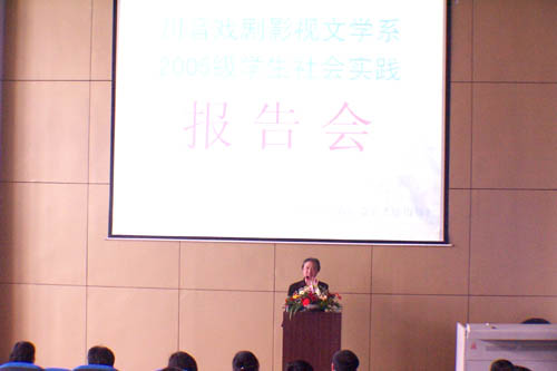 2007年4月12日,戏文系05级学生社会实践报告会在新都校区图书馆学术报告厅圆满举行。学院党委书记柴永柏,副书记彭建辉,副书记文云英,新管办主任刘立新,学生处刁处长等领导应邀参加了报告会。此外还有部分兄弟院系的系领导老师,以及学生会的干部应邀参加了报告会。