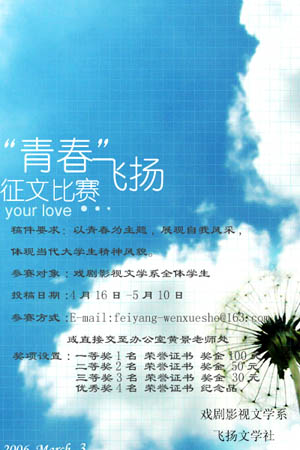 2007年4月中旬,我系团总支飞扬文学社开始启动首届征文大赛活动。这次征文比赛以“青春”为主题,稿件要求:原创,文体不限,字数不限。征文内容观点鲜明,立意新颖,思想积极上进,体现出当代大学生的精神风貌和思想状况。5月11日-5月16日审稿,确定优秀名单。参赛作品我们将采取公平、公正、公开的原则,邀请专业教师和相关人员认真审稿。