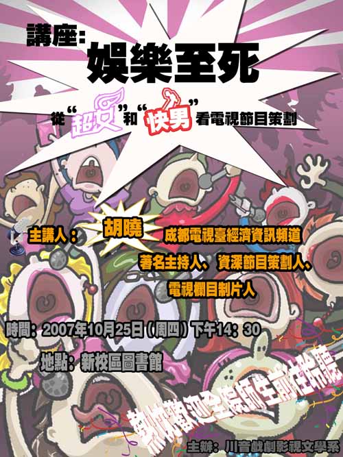 2007年10月25日14点30分,在新都校区图书馆报告厅里,在同学们的翘首期待中,迎来了成都电视台33频道著名节目主持人、电视节目策划人、制片人胡晓。胡晓又是红极一时的005、2006《超级女声》和2007《快乐男声》成都唱区总导演、主持人。英美语言文学学士,中国电视艺术家协会会员。这个曾主持过数百场大型电视直播节目的金牌主持人,一身学生气质的打扮,俨然一位优秀的学长,带着他特有的平易近人,开始了他的讲座——《娱乐至死—--从“超女”和“快男”看电视栏目策划》。