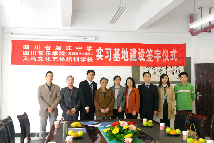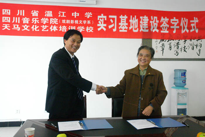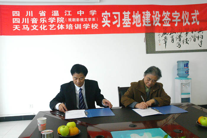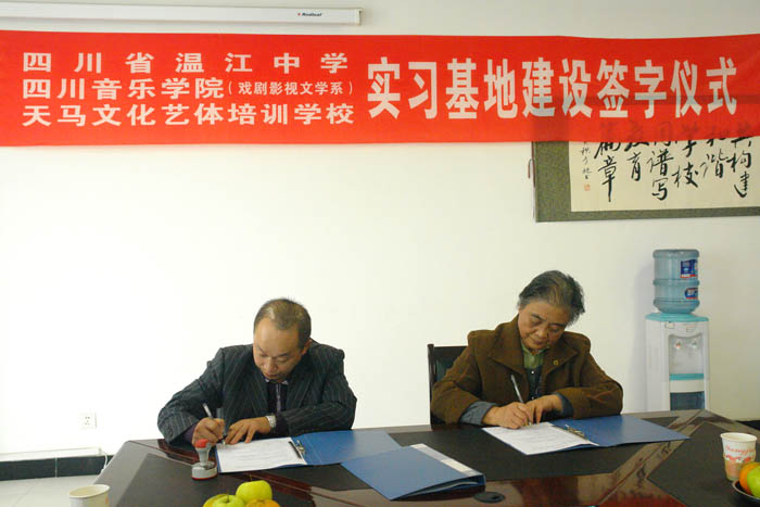 2009年10月28日下午,beat365在线唯一官网戏剧影视文学系“实习基地建设签字仪式”在温江中学举行。戏剧影视文学系主任王慧才分别与温江中学和温江天马培训学校签订实习基地建设协议。系党支部书记褚明蓉、系办公室主任王安维、辅导员教师等参加签字仪式。 该协议的签订意味着戏文系拓宽了学生实习实践的渠道,同时为我系选拔中学艺术人才奠定了基础。 仪式结束后,合作三方就我系学生实习实践有关具体问题进行商议。