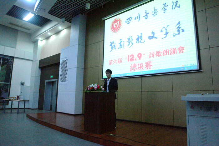 聆听诗歌魅力,诉说风华正茂,2009年12月9日(星期三)晚上6:00点戏剧影视文学系第六届12.9诗歌朗诵决赛在学术报告厅隆重举行。本次活动由戏剧影视文学系团总支主办,戏剧影视文学系学生会承办,风华剧社、飞扬文学社、诗歌兴趣小组协办,戏剧影视文学系党组织书记褚明蓉、系办公室主任王安维、系主任助理左芝兰副教授等老师出席了此次活动。 朗诵会中涌现出一大批优秀的原创作品,有08级张凯悦同学创作的古香古色韵味的《年少》,有杜伟 同学大气磅礴的《祖国颂》,亦有凌欣欣感人至深的《父亲跪下了》,更有呼吁保护藏羚羊的原创作品《最后一只藏羚羊》,也有送给即将毕业的06级同学的《时光》等等,各类原创题材涌现出来,获得了同学们的热烈掌声。朗诵会上更是重温了一些经典诗歌如《雨巷》《致橡树》《乡愁》等优秀作品。 活动最后以任晓楠老师和左芝兰老师的精彩点评作结,整个活动过程热烈而精彩,12•9诗歌朗诵会圆满结束。