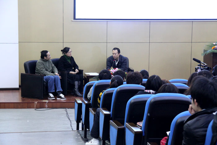 在12月5日上午10点钟召开的青年教师论坛上,林婧婧作为新片《观音山》导演助理为同学们讲述了她的《观音山之旅》。林婧婧老师详细地为同学们讲述了拍摄工作前期、拍摄过程中遇到的各种困难,以及影片杀青后参加东京电影节等系列事项,让同学们深切、真实地了解到一部影片的详细拍摄过程。林婧婧老师在讲述的过程中,还一边为同学们展示影片拍摄幕后的照片,讲述一些有趣的幕后花絮与真实的拍摄方式和拍摄场地的制作方法,使同学们近距离触摸到了当代影视,也拉近了很多人心中现实与梦想的距离。