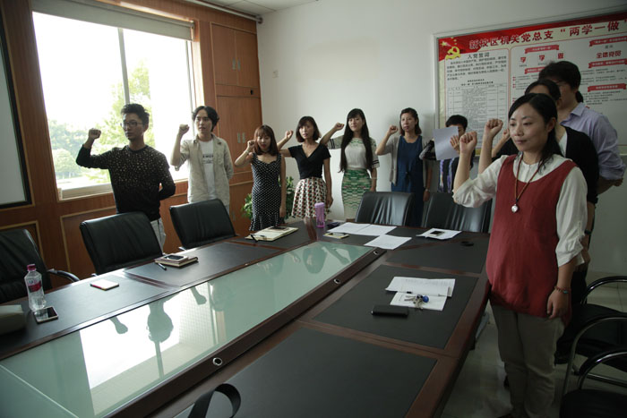 戏文系全体教职工在副系主任左芝兰副教授的带领下,全体肃立,面向国旗,右手握拳庄严宣誓:我们是光荣的人民教师,我们肩负着教书育人的神圣职责,承担着促进文化繁荣的光荣任务,承载着祖国富强的历史使命,为了不变的信念,为了永恒的追求,我们庄严宣誓:忠诚党的教育事业,牢记宗旨,不忘初心………甘守三尺讲台,争做“四有”教师,弘扬蜡烛精神,为教育事业奉献智慧和才华。