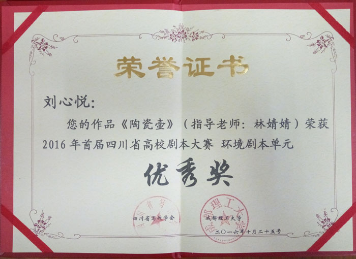 我系在近期落幕的“2016年四川省首届高校剧本大赛”中取得了可喜成绩。 其中,我系荣获优秀组织奖,我系学生刘佳君荣获原创剧本单元三等奖,我系学生刘心悦荣获环境剧本单元优秀奖。