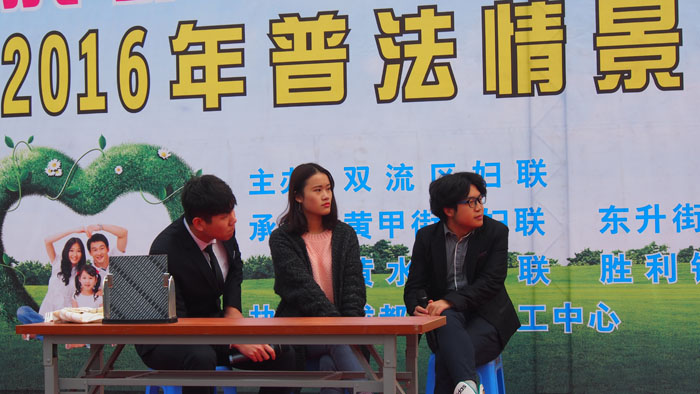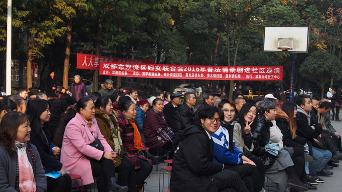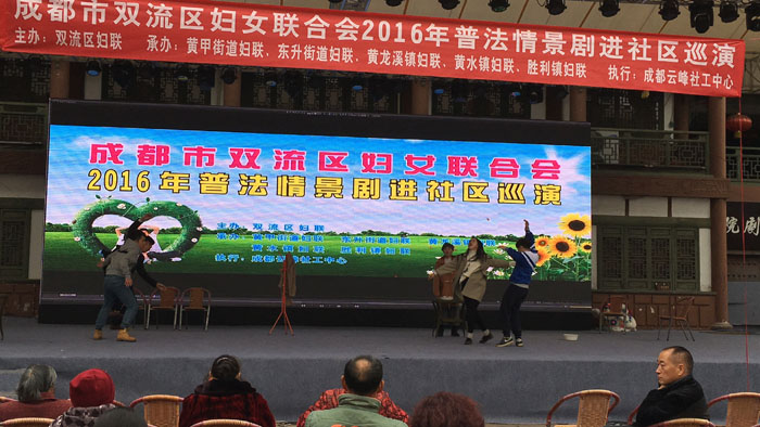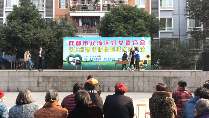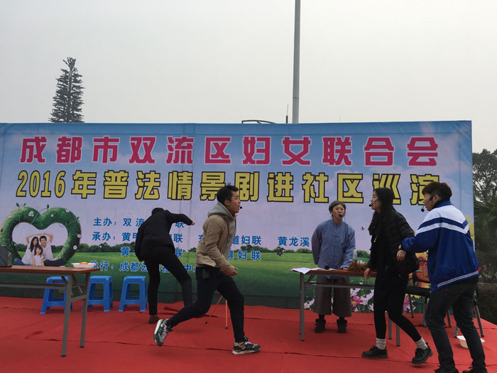 日前,双流区妇联2016年普法情景剧进社区巡演活动在东升街道普贤社区的文化广举行。 活动现场,普贤社区数百位社区居民一起观看了由beat365在线唯一官网戏剧影视文学系学生创作排演的反家暴主题情景剧《贾德故事》。催人泪下的故事情节,演员们精彩的演出,赢得了现场观众阵阵热烈的掌声。 该情景剧为戏文系学生习作,由我系副系主任左芝兰副教授全程指导。从剧本创作、表导演编排、舞美道具制作全部由我系学生独立完成。此次巡演,旨在积极向基层群众进行法制宣讲,促进和谐友爱家庭建设。接下来,普法巡演还将陆续在东升街道、黄甲街道、黄龙溪镇等街道、乡镇上演。