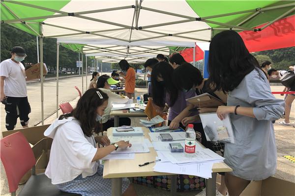 6月16日省内学生、6月19日省外学生共计203名毕业生在毕业班辅导员的指引下分批有序报道,严格按照学校报到流程,在进校门入口处完成身份识别、体温测量、核查健康码,核查环节通过后依次进入校园。在学院报到注册点再次核查并确认个人信息,提交相关资料。在整个报到期间,我院返校学生均有序排队,自觉保持一米以上间距。报到结束后,毕业学生陆续在图书馆学术报告厅领取毕业相关资料,随后返回学生公寓整理个人用品后有序离开学校。