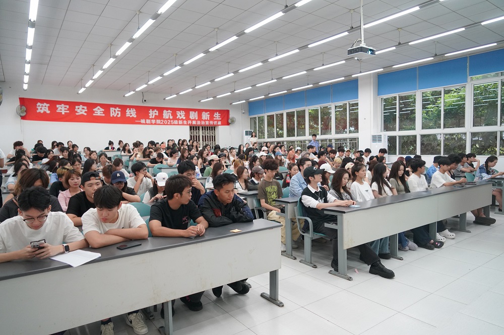 首先,戏剧学院党委副书记陈玮代表学院对2025级新生的到来表示欢迎,并强调了安全教育作为大学生“开学第一课”的重要性。陈书记指出,大学是人生新征程的开始,保障个人安全是学业成功和生活愉快的前提,希望全体新生能认真聆听、学以致用,将安全意识深植于心,共同营造一个安全、和谐、稳定的校园环境,为未来的专业学习和艺术追求打下坚实的安全基础。