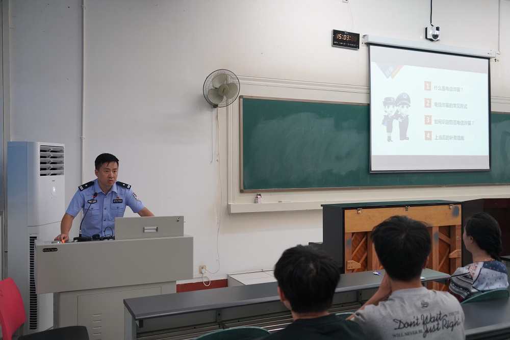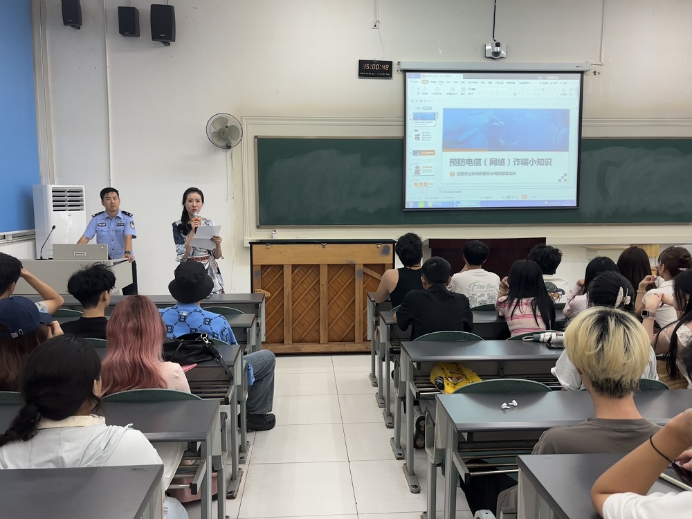 宣讲中,任所长结合其丰富的基层警务工作经验,通过剖析近期高校内及新都区周边发生的真实典型案例,深入浅出地介绍了诸如“刷单返利”、“冒充客服”、“网络交友”、“虚假购物”等多种大学生群体易遭遇的诈骗手法。任所长详细讲解了每种骗局的行骗套路、关键特征以及防范要点,语言生动、警示性强,还反复强调了“三不一多”原则——即“不轻信、不透露、不转账"。