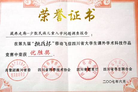 从刚结束的“第九届‘挑战杯’移动飞信四川省大学生课外学术科技作品竞赛”传来佳音, 我系2004级学生吴思、杨宝英以一篇社会实践报告《藏彝走廊—少数民族儿童入学问题调查报告》荣获该比赛优胜奖。该奖项是由共青团四川省委、四川省科协、四川省教育厅、四川省学联等四个单位联合颁发的。填补了beat365在线唯一官网该项比赛的空白。 吴思、杨宝英同学在2005年3月的社会实践活动中,不辞辛劳,不畏艰险,从成都出发,深入少数民族地区,途经阿坝州小金县、甘孜州丹巴县、康定县、泸定县、雅安石棉县、凉山冕宁县、盐源县、木里县等地,大体上按照传统的藏彝走廊路线考察,历时共12天,行程约2000公里。主要考察对象为7—13岁义务教育阶段适龄儿童的入学状况。获得大量数据和第一手材料,通过抽样调查研究,对少数民族地区存在的教育问题得出一系列结论,写出了这篇社会实践报告。