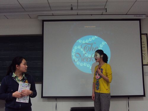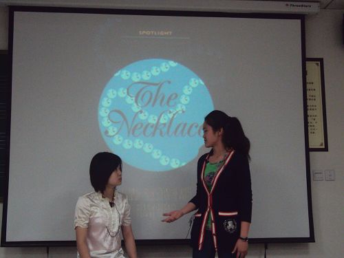 2010年5月20日,在新教学楼307高一年级开展莫泊桑《necklace》独幕剧的演出。 每个班的同学在舞台上淋漓尽致的展示着,里面的主角活灵活现的呈现在我们的眼前。莫泊桑的《Necklace》由我们这一群青少年,用我们的认知与认识展示着我们心中的那一串“Necklace”的模样。这一次的年级交流活动大获成功,使我们更深入的了解到欧洲艺术,亲身体会欧洲艺术。