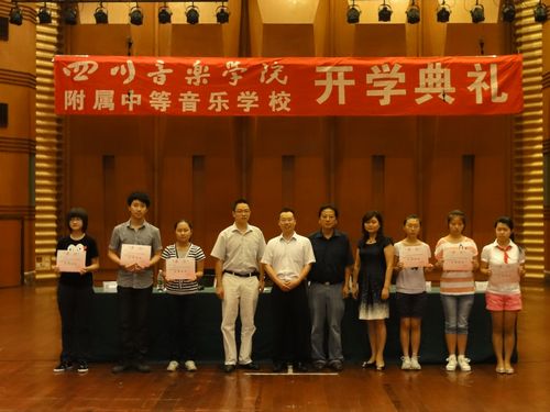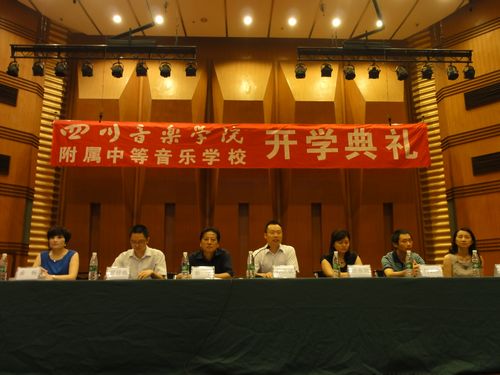 2011年8月29日上午,川音附中在大音乐厅举行了新学年的开学典礼,同学们井然有序地来到会场,出席会议的领导有学院党委常委副院长孙洪斌教授、附中校长蔡宇教授、附中副校长高级讲师唐燕翎、附中党总支副书记、高级讲师罗祥勇、附中校长助理、高级讲师何云洪、附中学生科科长、高级讲师董畅、附中教务科科长、高级讲师邱平。