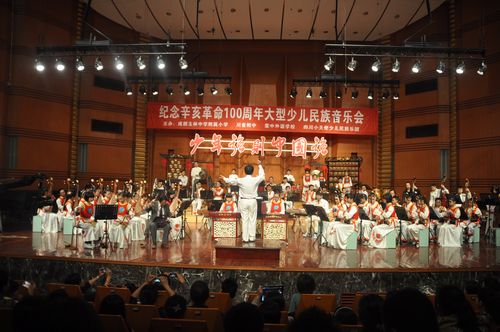 2011年10月6日晚7:30,由附中及成都玉林中学附属小学、四川双流棠湖中学外语实验学校、四川小天使少儿民族乐团共同发起并联合主办的一场“少年强则中国强纪念辛亥革命100周年大型少儿民族音乐会”在学院大音乐厅隆重举行。 音乐会由三校一团的228名乐手组成。其中,附中民乐专业的学生积极参与,倾情出演。整个团队也是人才济济,个个身手不凡。演出大气磅礴、蔚为壮观,声部编制齐备,规模庞大,曲目风格多样,演奏几近成熟。具有一定的专业性、艺术性和欣赏价值,并具相当大的视觉冲击力和听觉穿透力,令人耳目一新。 此次音乐会抒发了当代青少年的爱国主义情怀,彰显出他们积极进取,健康向上,热爱生活,热爱艺术的精神风貌。