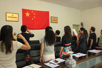 2016年9月6日下午三点,全体附中教师在三楼会议室集中,在附中蔡宇校长、党总支唐燕翎书记带领下一起学习了习总书记“五一前夕在知识分子座谈会的讲话”和“七一讲话精神”,李保国同志先进事迹等。紧接着,老师们紧握右拳面对国旗,在唐书记带领下全体教师在国旗下庄严宣誓:忠诚党的教育事业,牢记宗旨,不忘初心;遵纪守法,诚实守信,爱岗敬业,诲人不倦;因材施教,关心学生,为人师表,德艺双馨;严谨治学,开拓创新;坚守三尺讲台,争做“四有”教师,弘扬蜡烛精神,为教育事业奉献智慧与才华! 宣誓结束后,结合“两学一做”学习教育,唐书记继续组织大家进行认真的讨论,相信全体附中老师将以更加饱满的精神和热情投入到新学期的教学工作中。