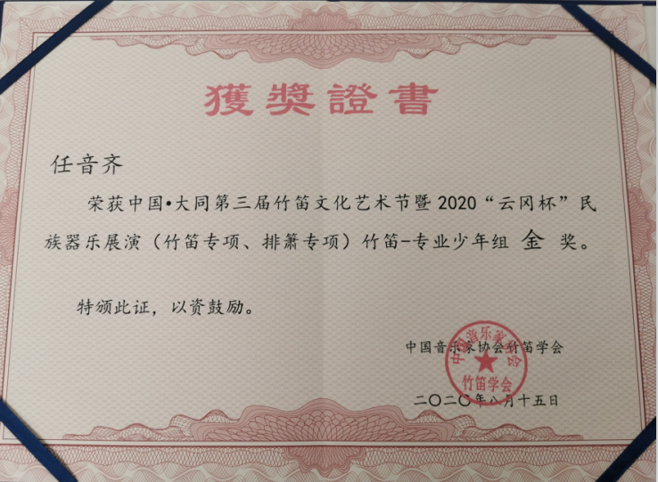 附中学生任音齐参加第三届中国·大同竹笛文化艺术节荣获金奖