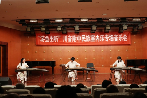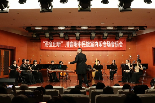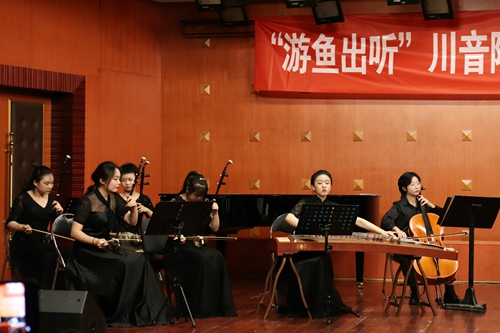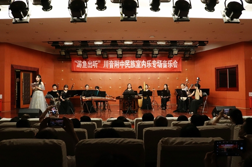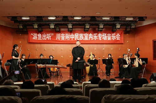 2021年6月9日晚7:30,在学院聂耳音乐厅举办了“游鱼出听”附中民族室内乐团音乐会,由川音民乐系青年教师欧阳庆担任指挥。