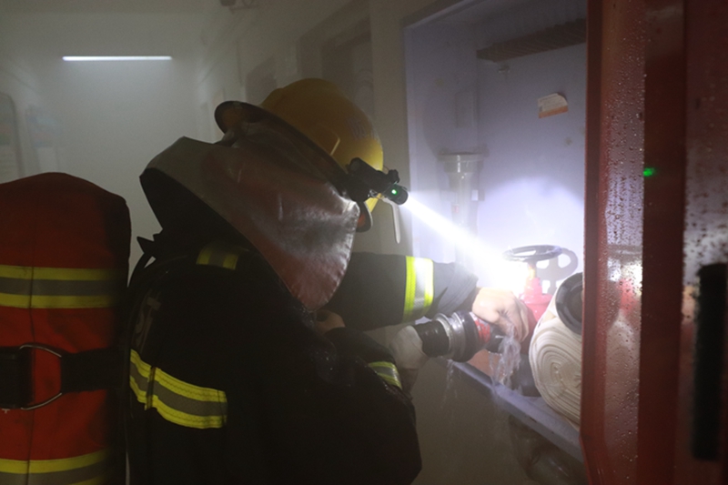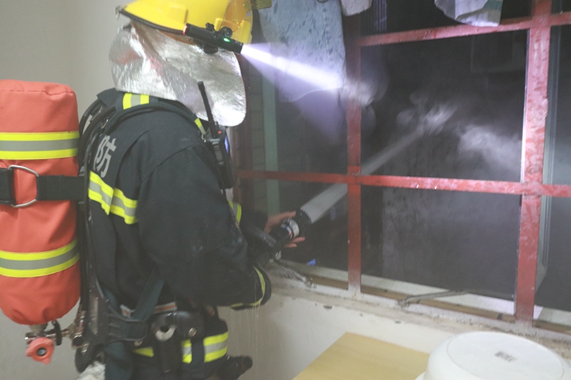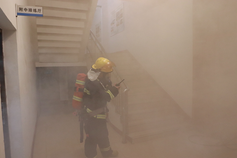同学们按要求回到寝室,各楼层发出烟雾后在老师的紧急催促和指挥下迅速用毛巾捂住口鼻俯身有序撤离到楼下安全地带,学院消防车第一时间赶到宿舍楼做出火情初步处理,紧接着龙江路消防中队两辆消防车紧急赶到现场,消防员火速跳车冲进宿舍楼,整个演练一气呵成,师生们爆发出热烈的掌声。