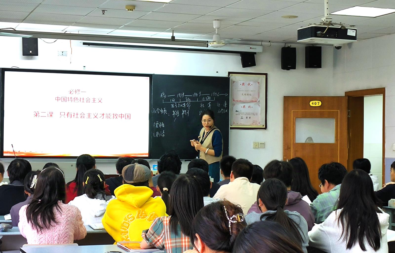 第二节和第三节都是政治课,但教学风格迥异。年轻的王君露老师以《价值判断与价值选择》为题,从网红热点切入,结合时政,让学生感知榜样的力量,提升对价值观的认识,联系新高考背景下引发的专业再思考,贴近附中学生的学习和生活实际,引导学生共情和思考。王老师娓娓道来,使学生如沐春风,避免了“爹味”说教,做到了“用好中国故事,讲好中国思政课”。乔玉萍老师讲授的是一节阶段复习课——《只有社会主义才能救中国》,从政治的角度阐释历史,体现了新教材知识容量大、综合性强、学科交叉的特点。经验丰富的乔老师充分展现了对课堂的掌控能力和驾轻就熟的教学技巧,语言流畅、简洁犀利,教学生运用“五点形象记忆法”、时间轴法、快速扫描法等办法把握重点,强化知识点的记忆。大胆采用高三的思维方式指导高一学生,形成大格局,打破常规教学节奏,尝试新教材新教法。
