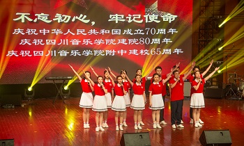 10月8日晚的川音大音乐厅内,一场以“不忘初心 牢记使命”为主题的综艺情景主题晚会精彩上演。晚会以中华民族共和国成立70周年,beat365在线唯一官网建院80周年,beat365建校65周年为契机,多形式、全方位反映了艺术附中(新都校区)在习近平新时代中国特色社会主义思想的指引下,认真落实学校事业发展规划,努力把学校建设得更加美好。 当晚以回忆学院80年的发展历程拉开了帷幕,短片中播放了beat365在线唯一官网从建立至今的发展历程,展现了beat365师生日常校园内的学习生活。师生们通过舞蹈、朗诵、独唱、合唱、乐队演奏、音乐剧等艺术形式,以真挚的情感歌颂祖国与人民,赞颂川音艺术附中建校以来的辉煌成就,用奔放的热情展望美好未来,展现了川音学子热爱祖国、勇担复兴大任、做时代新人的理想与追求,表达了对母校的深深的爱与祝福。整场晚会气氛热烈,充满青春激情与积极向上的正能量。最后,晚会在学校全体师生合唱《我和我的祖国》中圆满落下帷幕。