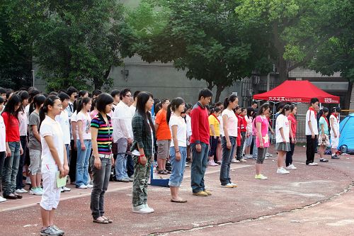 2008年5月19日早上8:00。为悼念在5.12汶川大地震中遇难的四川同胞,附中师生在升旗仪式前默哀一分钟。国歌之后,旗杆顶端的五星红旗缓缓下滑,降落至三分之一处,全场一片肃静,全校师生沉浸在深切地悲痛之中。愿死者安息,生者坚强。