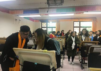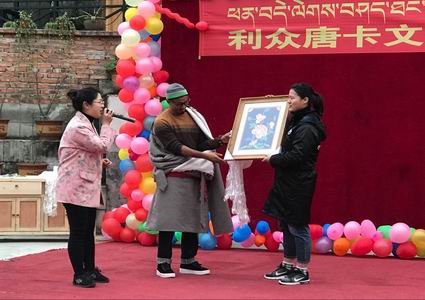 下午,恰逢“利众唐卡文化艺术中心开办七周年庆典”,作为客人,我们也准备了许多形式多样的节目和这里的师生一同欢庆。在二十余个节目中,有唱歌、有跳舞、有古琴弹奏、单簧管吹奏、小品、街舞、也有诗文朗诵等。其中设置了抽奖活动,奖品设置丰富,特等奖是恩珠老师的一幅装裱好的唐卡作品;一等奖是三幅不同的挂布唐卡;二等奖是印有唐卡佛像的T恤;三等奖是印有手绘唐卡图案的杯子。其中我系不少同学幸运地抽得了各类奖品,由其我系本科大三的一名同学更是幸运抽得了特等奖。参加该庆典的还有西南民族大学和成都大学的同学们,以及当地附近的居民,观众为台上的同学欢呼呐喊,现场气氛非常热闹。