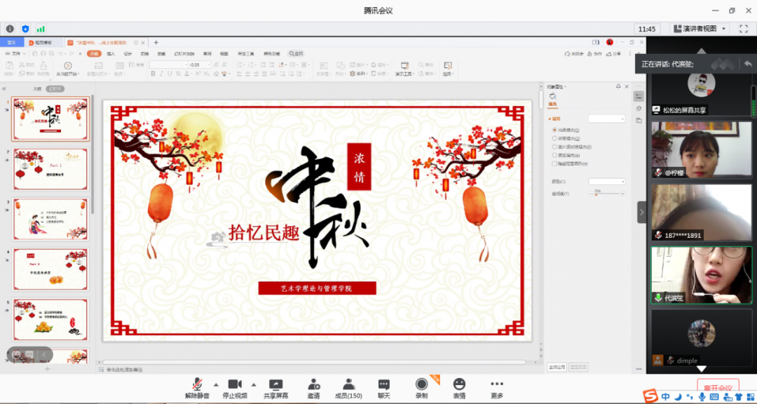 中秋,一个洋溢着亲情的节日;一个诉说着团圆的节日;一个释放着思念的节日。 10月1日下午4点,艺术学理论与管理学院的师生同聚线上,共抒金秋的喜悦,一起欢度这中秋国庆双节的美好时光。 本次线上中秋活动的主题是“浓情中秋,拾忆民趣”,希望通过开展本次活动,拉近学院师生关系,让同学们感受到学院的关怀与祝福。同时,让同学们充分感受中华传统文化的魅力,增强传统节日文化理念,弘扬创新节日文化,让节日真正给我们带来快乐与幸福。 活动分为四个环节进行:趣味故事分享、中秋美食共享、话说诗词与文创和互动问答。 趣味活动版块结束之后,学院领导、老师、同学们互送祝福。至此,本次线上中秋活动圆满结束。