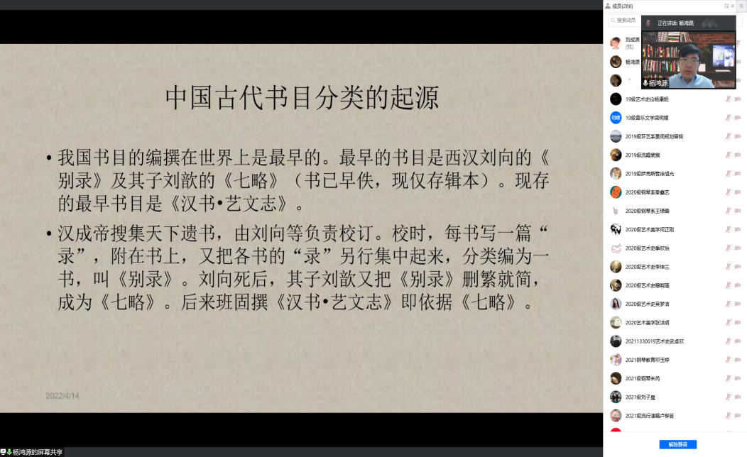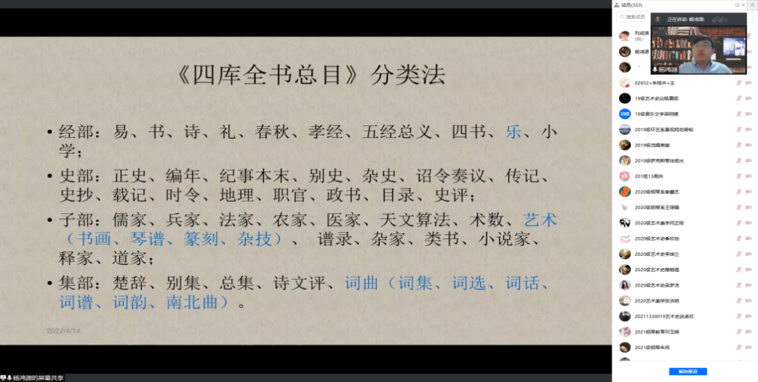 槐序时节,万物葱茏。由艺术学理论与管理学院举办的博士教师大讲堂系列讲座(第1期)“中国基本古籍的分类检索及学业相关问题探讨”于4月14日晚7时在腾讯会议正式展开,虽然因疫情防控需要,博士老师们无法线下与大家见面,但同学们热情不减、踊跃观看,三百余名本科生、研究生齐聚一堂,共同聆听这场知识的盛宴。