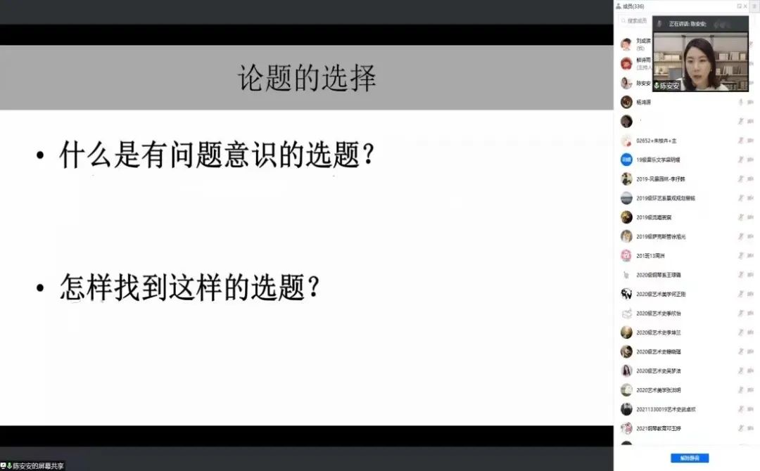 在论文写作上,陈老师从艺术与艺术类论文的关系入手界定论文的重要概念,指出了学生论文写作中的常见问题,切中了毕业季学生的痛点与盲点,并给出了行之有效的写作方法论指导。她将语言、论题选择、结构、文献综述、开题陈述、论文精读与投稿、时间分配、论文数据库检索等内容与具体的论文实例相结合,剖析了论文写作中观察问题的角度、分析问题的思路、论证问题的方法。