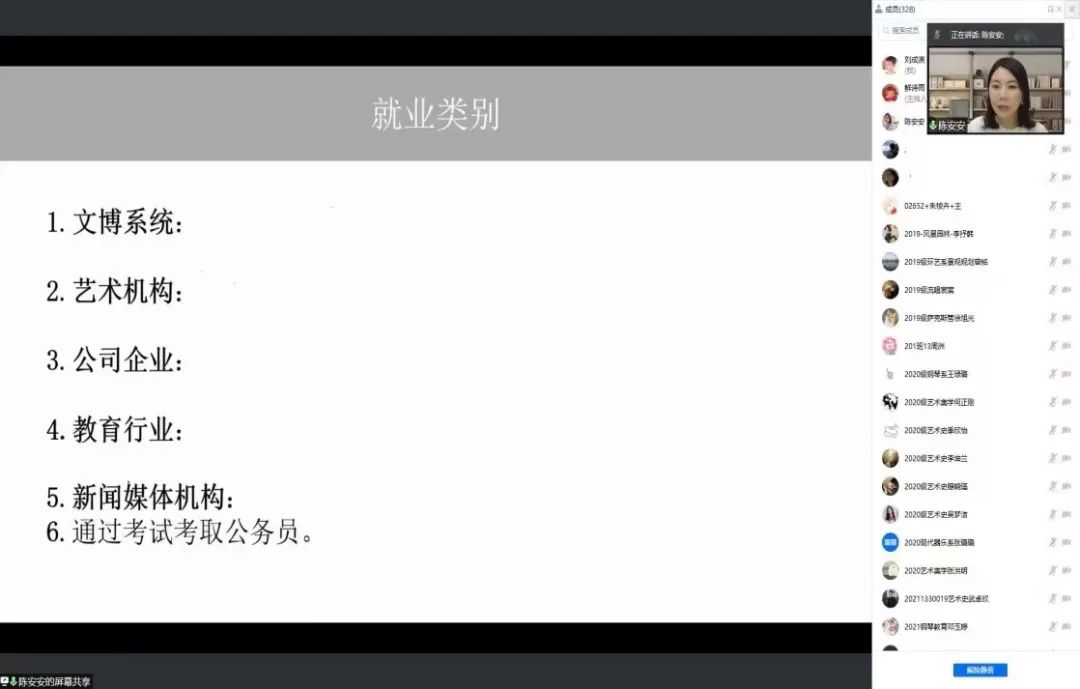 在就业方向上,陈老师结合时事,以对当前艺术类专业就业环境有重要影响的事件为切入点,提出当前艺术类专业具有就业前景广阔、艺术市场充盈的良好态势,为同学们鼓舞士气、提振信心。同时她选择了适合艺术管理、艺术史论、艺术美学、文化产业管理等专业的就业方向进行逐一讲解与分析,以便同学们了解就业情况,把握相关资讯。另外在学业深造上,陈老师站在本科生、研究生等不同学段的角度,分享了考研与考博的心得体会。这些肺腑之言为大家提供了一把衡量的标尺,有助于他们在就业与学业选择之路不随波、不盲从,明确思路与方向。