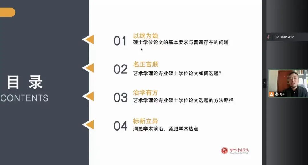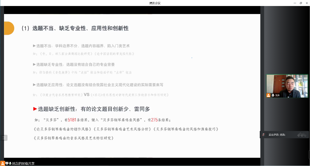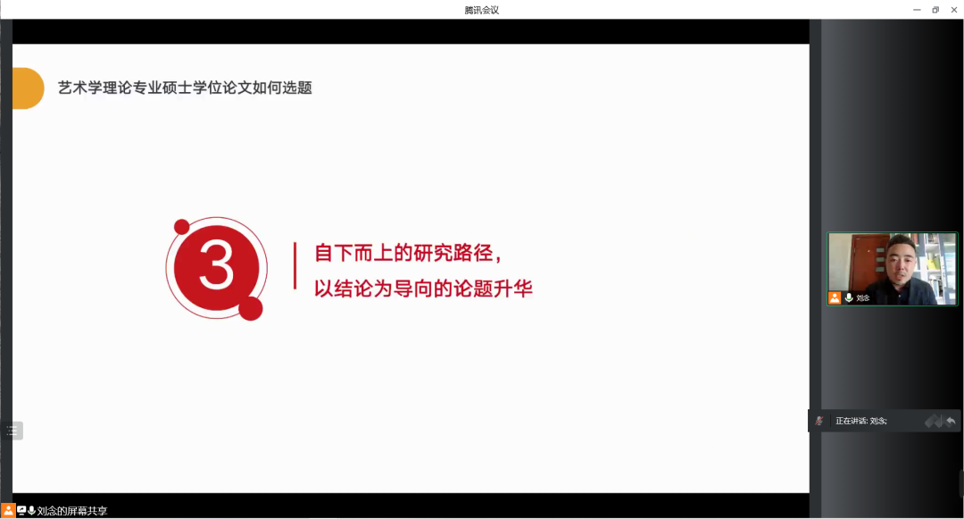 其次,刘念老师分析了艺术学理论专业硕士学位论文如何选题。第一,选题需要树立学科意识、明确选题边界;第二,选题需要以门类艺术为研究对象,实现从特殊到一般的视角转换;第三,选题需要自下而上的研究路径,以结论为导向的论题升华。