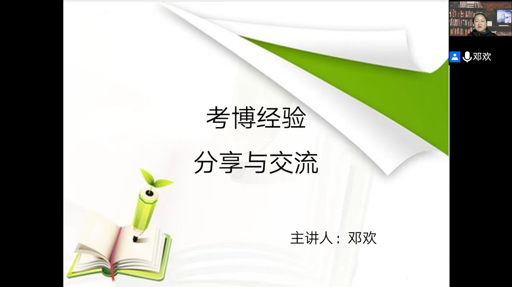 孟夏时节,生机勃发,欣欣向荣。为帮助同学们了解目前的博士招考制度,以及给有意深造的同学答疑解惑,4月22日18时,艺术学理论与管理学院举办的博士教师大讲堂系列讲座第4期,由邓欢老师主讲的“考博经验交流分享会”在腾讯会议直播平台正式展开。老师同学们怀着极大的热情,专注聆听讲座,踊跃参与讨论。