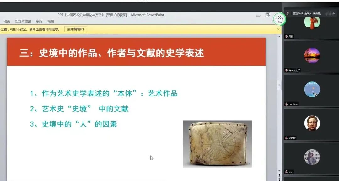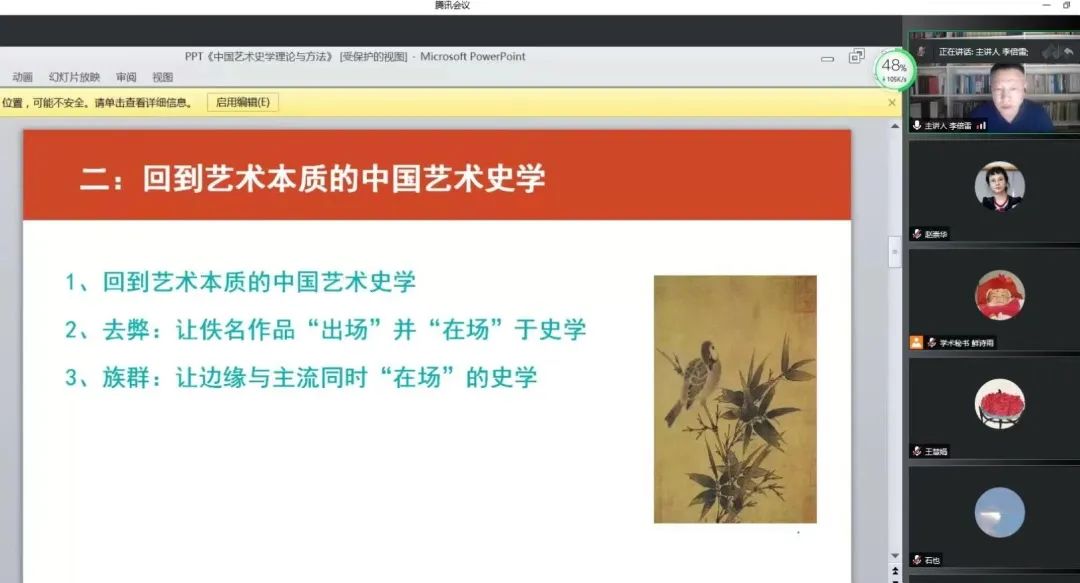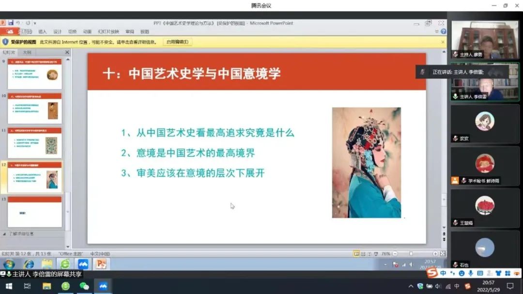 归纳起来,李倍雷教授的讲座,集中体现出十大观点:一是中国艺术史的形状应该是一个“汇通”的概念,即在各门类艺术史和文人艺术史、宗教艺术史、宫廷艺术史、民间艺术史四个板块基础上进行整体、宏观研究所有史料的汇通,而不是简单的跨学科相加,是1+1大于2;二是中国艺术史应该是以中国艺术史料为中心、以中国传统思想文化为路径的、反映中国人内心世界的艺术史;三是艺术史的时空观是指在围绕作品为中心的艺术变迁时间轴上、把相近的艺术史料各空间点在整体文化逻辑上连接起来形成艺术史的形状;四是特定历史环境中艺术的发生发展和演变构成“史境”,其中“人”的因素包括“在场”和“不在场”的;五是必须树立中国大历史观和中国文化整体感,艺术史不过是其中的“专门史”、“小支流”;六是艺术史学体例结构应包含五个要素:艺术作品、艺术家、艺术文献、史境以及贯穿所有的文化逻辑;七是中国艺术史必然体现儒家主体、道家本体的中国传统文化精神;八是由艺术史料而展现的从礼仪、教化到意象、意境等,体现着中国艺术史变迁的史学价值与意义;九是丰富多彩的民间艺术构成了艺术史的多层结构,使艺术史更加完整,更加系统;十是中国艺术史的研究应该充分体现“意境”这一中国艺术审美的最高境界。