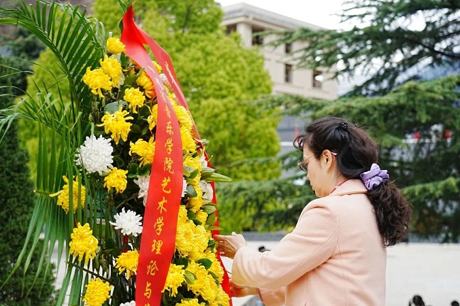 在烈士碑前,2名学生抬着花篮缓步向前,踏着铿锵的步伐走向烈士墓前,代表艺术学理论与管理学院全体师生向烈士敬献花篮。艺术学理论与管理学院党委书记赵崇华同志认真地整理缎带,表达对革命先烈的深深悼念和仰敬。
