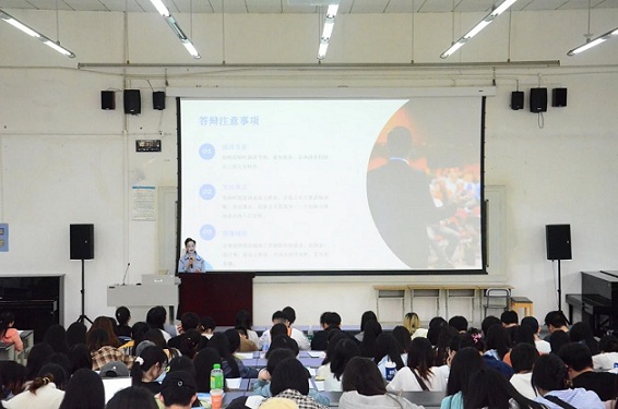 其二,陈洁副院长还强调了答辩注意事项。指出一要注意答辩节奏,避免拖沓,将总时长控制在三到五分钟内;二要突出重点,答辩时简要讲述论文框架,讲述语言尽量流畅清晰,突出重点,围绕一个创新点深入论述足矣;三要学会图像辅助,合理使用视觉辅助工具如图表、图片进行答辩演讲,使论文框架、内容呈现更清晰、更直观易懂。