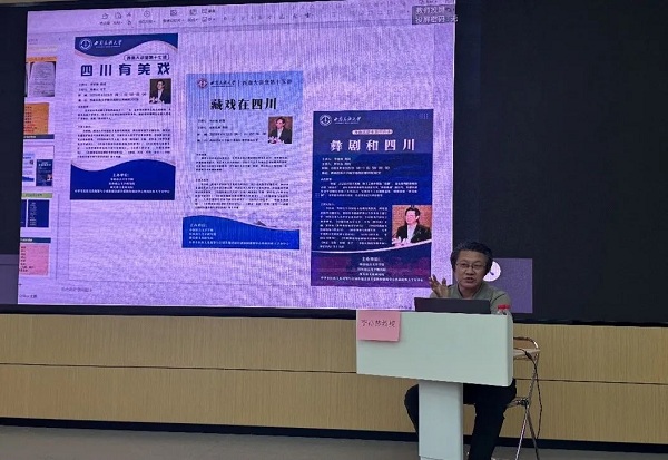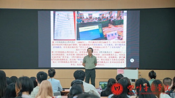 李祥林教授在讲座中谈到《四川傩戏志》在民族戏剧收录方面的重要价值。这部志书不仅收入了上述剧种,还首次将羌族的释比戏写入戏曲文献中。相较以行政区域为分类方式形成的《中国戏曲志》,《四川傩戏志》更强调族群归属和仪式背景,也体现出近年来戏剧研究中对文化语境和族群主体性的关注。他通过丰富的案例与详实的资料,介绍了巴蜀地区如川剧、羌戏、藏戏等多民族戏剧的发展脉络、艺术特色与文化内涵,深入剖析了其背后所承载的民族文化、历史记忆与民俗风情,让在场师生深刻感受到巴蜀多民族戏剧艺术的魅力与价值。尤为重要的是,李教授对如何进行田野调研给出了具体的方法和建议,为同学们如何获取一手文献资料,创新选题与研究思路,提供了可资借鉴的重要方法论建议。
