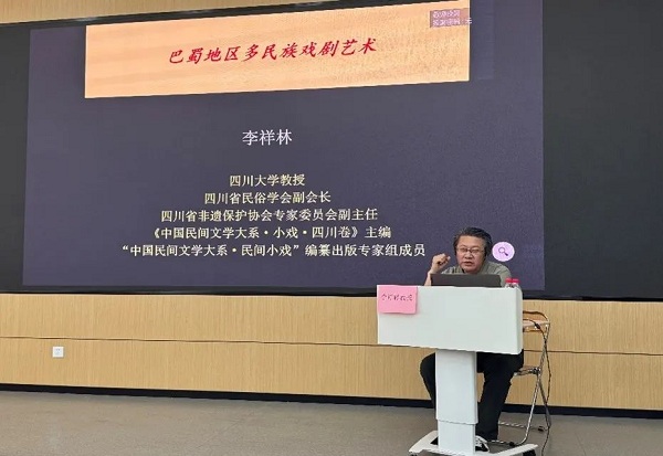 讲座伊始,李祥林教授从巴蜀地区的多民族戏剧入手,介绍了相关剧种的分布和文献整理情况。他提到,《中国戏曲志·四川卷》共收录了14个剧种,包括德格、康巴、嘉绒、安多等藏族地区的藏戏,以及流行于重庆石柱的土家族土戏。这些剧种在语言、表演形式和结构上各具特色,体现了巴蜀地区多民族文化的丰富性。