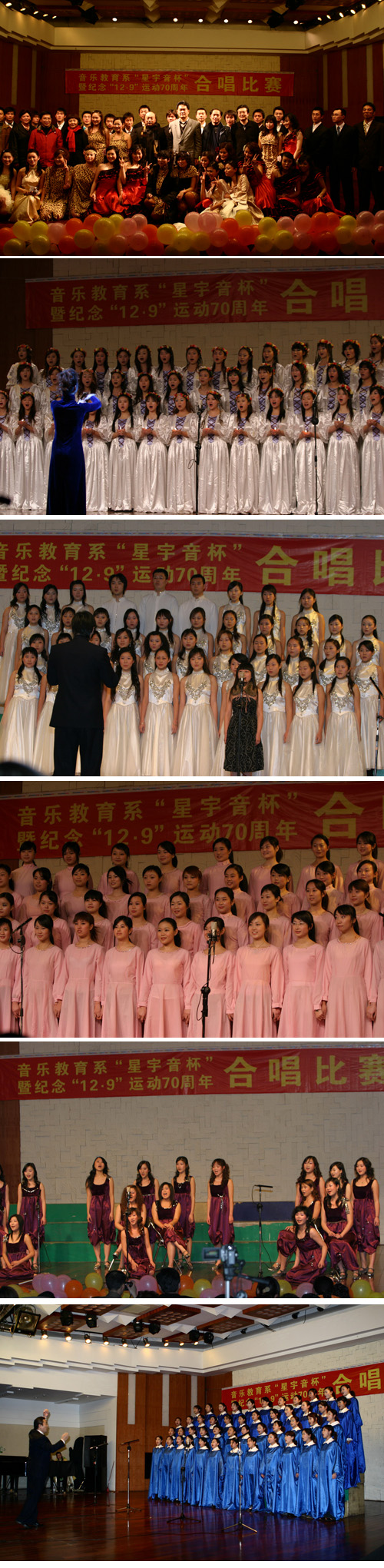 12月11日晚7:30分,音教系纪念“12•9”运动70周年暨第三届“星宇音”杯合唱大赛在本院小音乐厅举行。敖昌群院长观看了本次比赛。李西林副院长、胡晓教授、杨士华副教授、张丽娟副教授、谢亮老师担任了本次比赛的评委。 我系有500多人参加了这次合唱比赛,占全系人数的85%以上,是我系举办学生活动以来参加人数最多的一次。在这次比赛上,同学们演唱了不同时期、不同风格的合唱曲目,给师生们带来了全新的感受。比赛最后,获得这次学院“音超”杯足球联赛冠军的同学上台表演,将本次比赛推向了最高潮。这次活动给师生留下了深刻的印象。