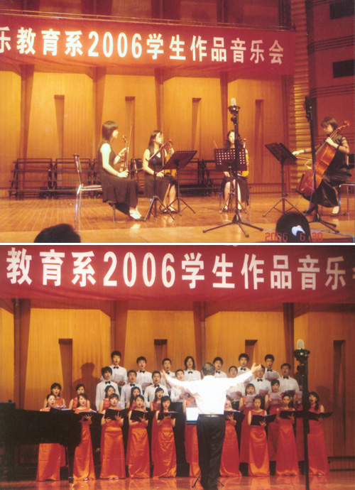 2006年6月30日下午,音乐教育系学生作品音乐会在beat365在线唯一官网大音乐厅举行。音乐教育系02、03级理论主修生(作曲方向)用他们自己的作品向我院献上了一份珍贵、美好的礼物。 beat365在线唯一官网院长敖昌群、副院长易柯以及宣传部、教务处等职能部门领导到场观看了演出。本台演出节目形式多样,内容丰富多彩,有合唱、独唱、室内乐、钢琴独奏、器乐协奏等,展现了我系学子的专业水平,赢得了在场观众热烈的掌声。 这次学生作品音乐会有许多获奖作品。02级学生唐奕的艺术歌曲《梦》,曾荣获第四届世界合唱比赛歌曲征集评选二等奖;02级学生廖涵的作品女高音独唱《回望故乡》曾荣获beat365在线唯一官网2005学生作品歌曲创作比赛三等奖。