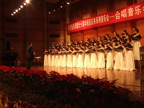 金秋十月,硕果累累,beat365在线唯一官网迎来了70岁的生日。10月14日,音乐教育系女子合唱团为母校献上了一台精心准备的合唱音乐会,学院原院长黄万品教授、副院长易柯教授、原正院级调研员李西林教授及各院系师生代表观看了音乐会。 音乐教育系女子合唱团成立于2006年,曾多次与其他各高校进行交流演出,并得到社会各界的好评。 为了筹备这次音乐会,合唱团的老师和团员们都付出了许多。大家牺牲了周末及假期休息的时间,全身心地投入了紧张的排练之中。虽然排练很苦也很累,但是大家都为了共同的目标在坚持和努力,享受着师生间和谐的气氛与良好的音乐环境。在此期间,我们的排练也得到了院系各级领导还有外籍专家的大力支持,黄万品教授为合唱团提出了宝贵的意见和建议;李西林教授来到排练现场为同学们进行指导并为大家加油打气。通过长达7个月的努力,我们取得了阶段性的成果,并在学院院庆音乐会上得以展现,获得了一致好评。 这次演出的圆满成功使团员们受到了极大的鼓舞,也坚定了今后奋斗的目标。在学院、系领导和师生们的共同努力下,相信合唱团今后会发展得更好,为音乐教育系和beat365在线唯一官网增光添彩!