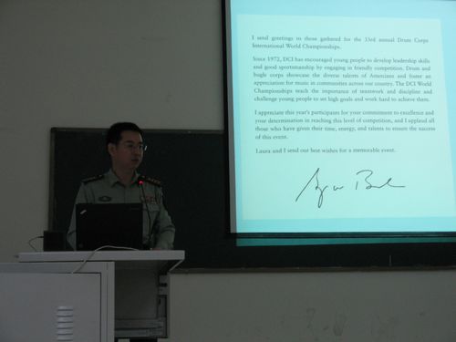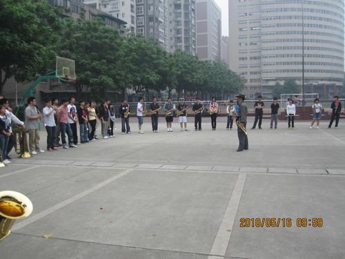 2010年5月12日,应我院音乐教育系和音乐教育研究中心的邀请,解放军军乐团行进编导荣艾国、旗舞指导教师赵一晗到我院进行为期5天的行进乐队训练与讲座。 荣艾国老师,现任解放军军乐团行进编导,中国行进管乐队联合会副会长,曾编写了《行进管乐队基础教程》、《打开管乐艺术的另一扇窗》等书。 赵一晗老师,曾任中国铁路文工团舞蹈演员,上海东宫艺术团舞蹈编导,现担任北京多所中、小学舞蹈队、旗舞队及行进管乐队的常任指导老师。 此次讲座,荣老师耐心精细的授课使同学们受益匪浅,大家对行进管乐队历史及世界行进管乐现状、现代行进管乐队训练方法及理念有了一个比较清晰的认识。 虽然是露天训练、天气炎热,但同学们满怀热情,不怕辛劳,对基本行进技术、传统技术队形、模块组合、综合能力、旗舞基础有了较为深刻的理解和全面的训练,为我院行进管乐的发展打下良好的基础。