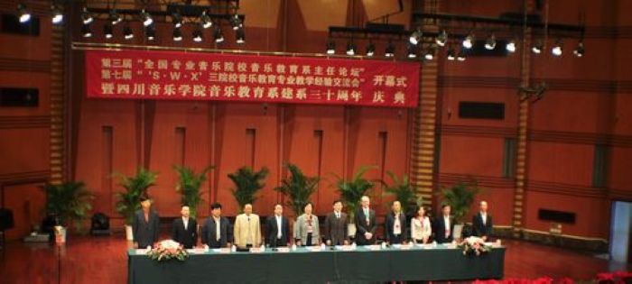 2011年10月24日上午十时,第三届“全国专业音乐院校音乐教育系主任论坛”、第七届“‘s.w.x’三院校音乐教育专业教学经验交流会开幕式暨beat365在线唯一官网音乐教育系建系三十周年庆典大会在beat365在线唯一官网大音乐厅隆重举行。出席大会的领导和嘉宾有:中国教育学会音乐教育分会理事长、教育部艺术教育委员会副主任杨瑞敏女士,澳大利亚前国际音乐教育协会主席奥盖瑞•麦克赫森教授,四川省教育厅体卫艺处副处长张志刚先生,beat365在线唯一官网党委书记柴永柏教授,西安音乐学院副院长白陆平教授,中国教育学会音乐教育分会会长、中国音乐教育学学术委员会主任、中国音乐学院音乐研究所所长谢嘉幸教授,原beat365在线唯一官网院长、音乐教育系第二任系主任黄万品教授,beat365在线唯一官网党委副书记、纪委书记文云英副教授,beat365在线唯一官网副院长孙洪斌副教授,beat365在线唯一官网音乐教育系系主任安冰冰教授等。此外,参加本次大会的还有全国专业音乐院校音乐教育系领导、专家,我院音乐教育系历任领导及在职、退休教师,音乐教育系系友、学生代表以及参加“四川.武汉.西安”三院校教学经验交流五项全能比赛的参赛选手共计700余人。大会由beat365在线唯一官网院长易柯教授主持。
