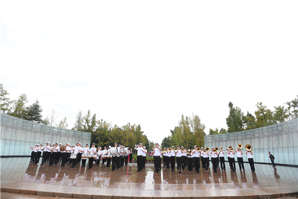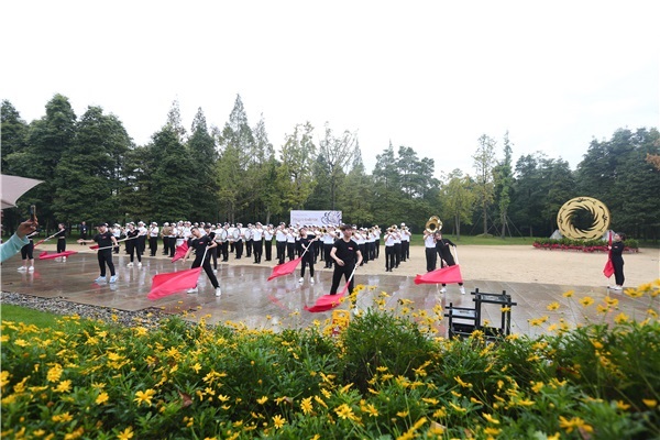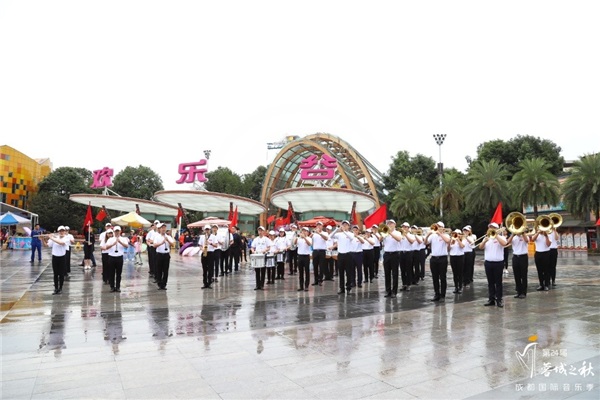 上午第一场冒雨表演行进管乐 市民游客加入表演