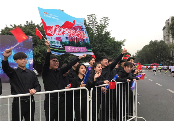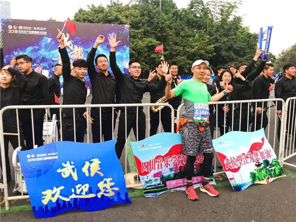 “2018成都国际马拉松”由中国田径协会、成都市人民政府主办,成都市体育局、成都传媒集团、成都天府新区管委会、成都高新区管委会、锦江区人民政府、青羊区人民政府、金牛区人民政府、武侯区人民政府承办。本次马拉松于2018年10月27日早上7点半开跑,来自全球54个国家的28000名运动员齐聚蓉城一起向终点奔跑。 本次马拉松赛段内设3个音乐加油站,其中,望江楼公园北门音乐加油站由音乐教育学院管乐团进行表演。管乐团的同学们于当天早晨6:30出发前往表演场地,在望江公园音乐加油站进行了长达两个多小时的表演,为参赛选手加油打气。此次表演不仅丰富了此次赛事的文化氛围,普及了管乐文化,也让同学们从中学习了坚韧的体育精神,尊重与包容的人文精神,以及弘扬了爱国主义精神。